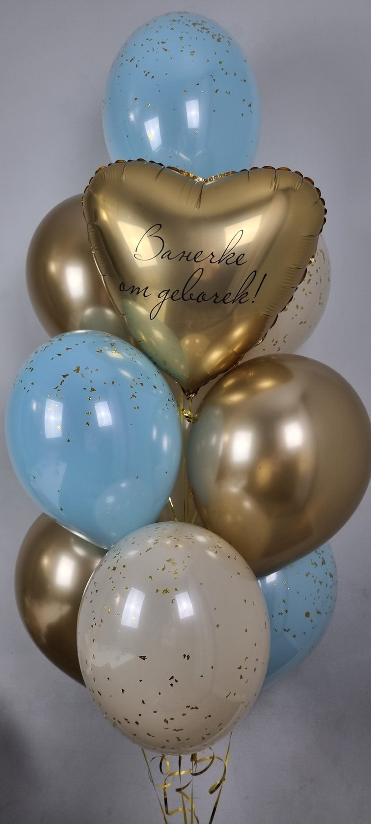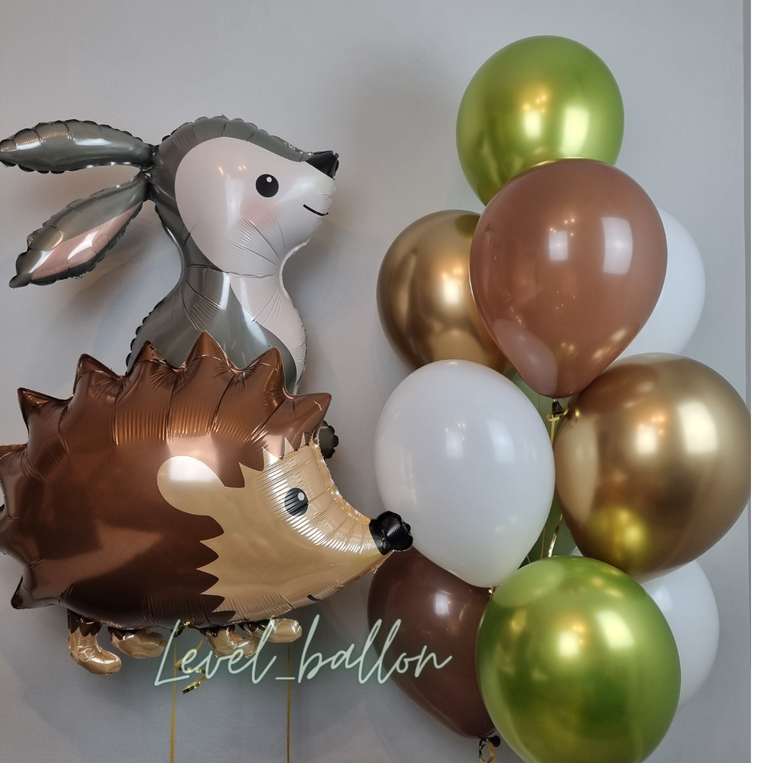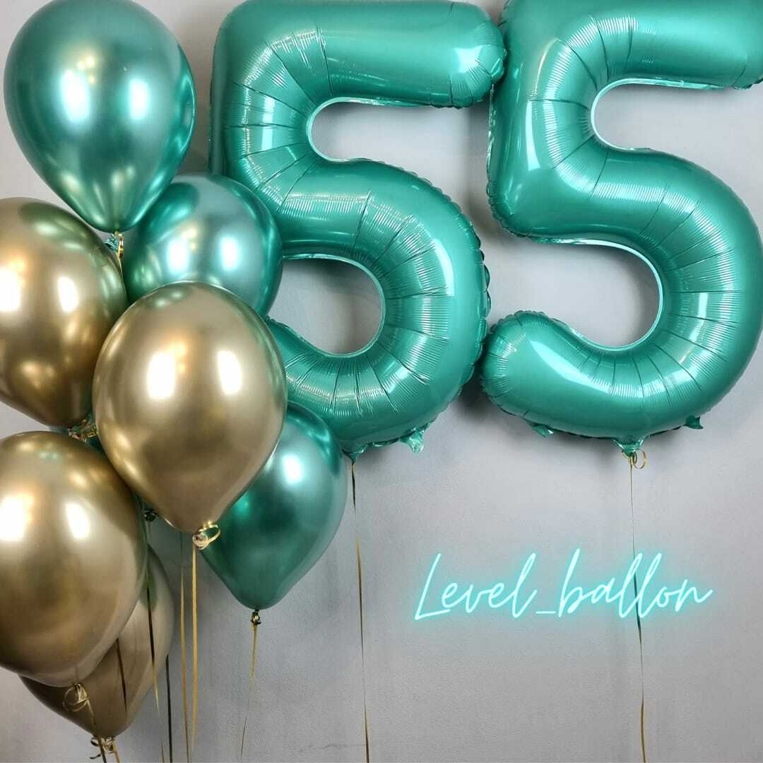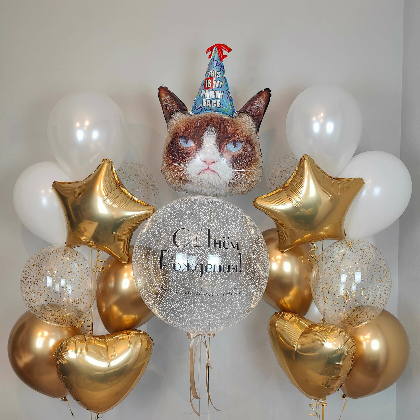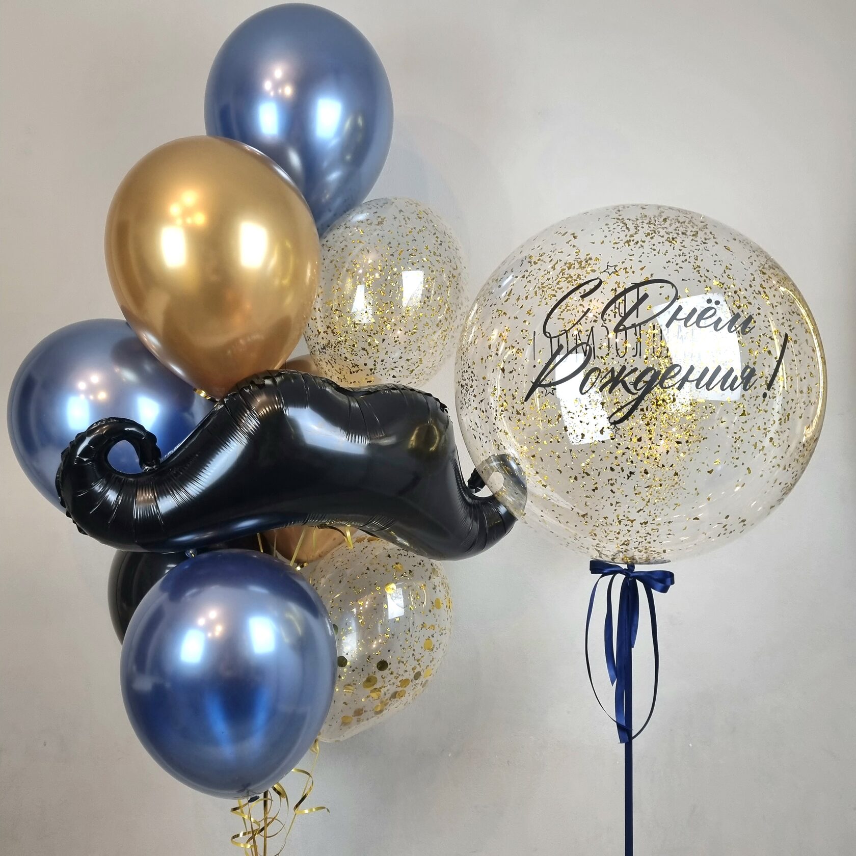 В набор входит: Большой прозрачный шар с конфетти 55 см с индивидуальной надписью; Фонтан из 10 шаров (фигура "Усы", 2 с конфетти, 7 хром).