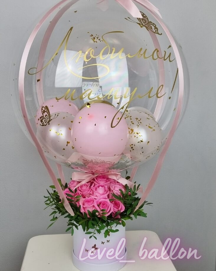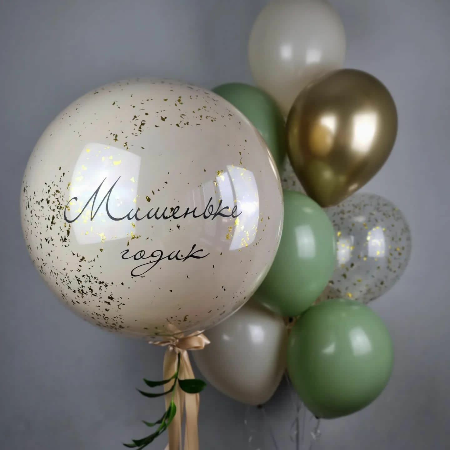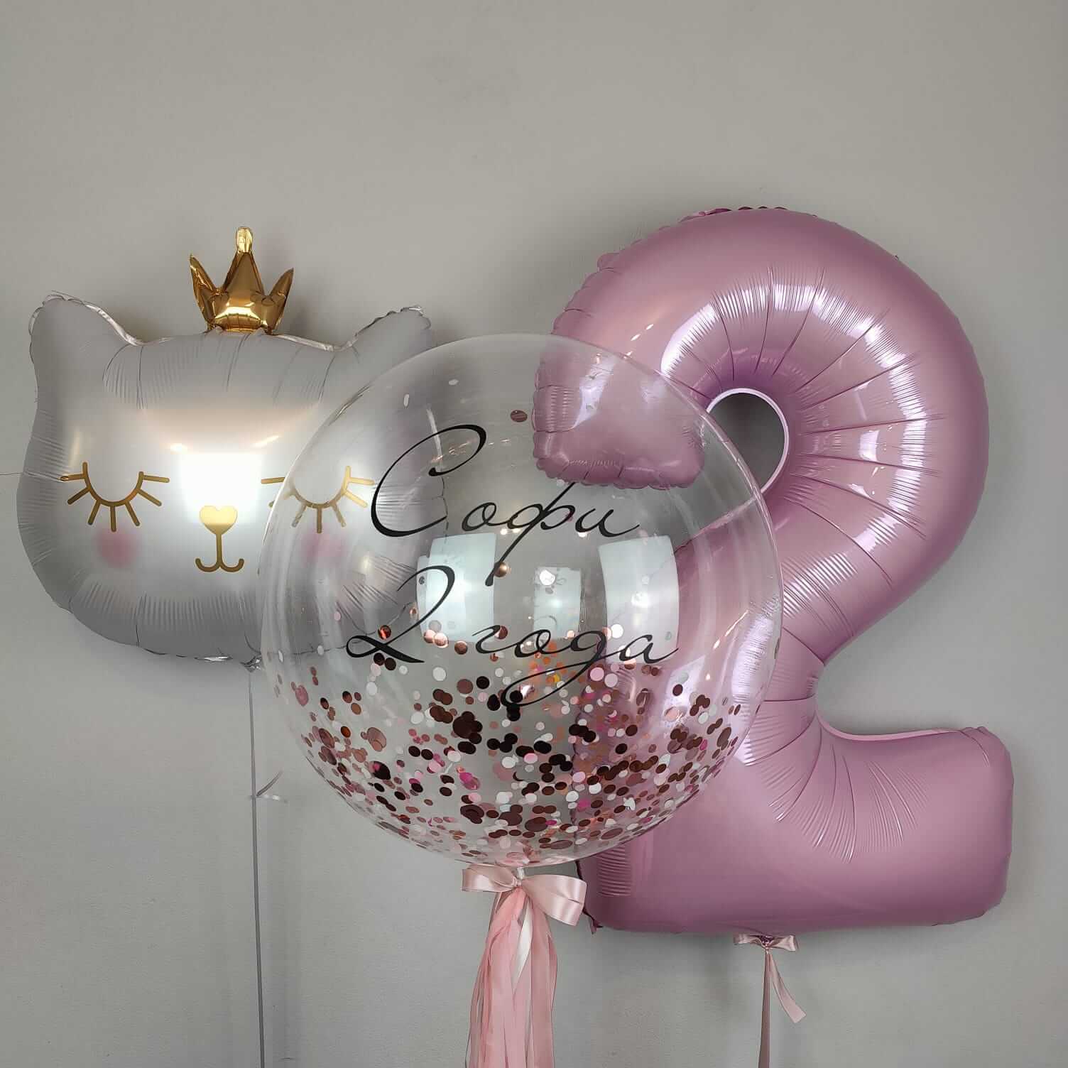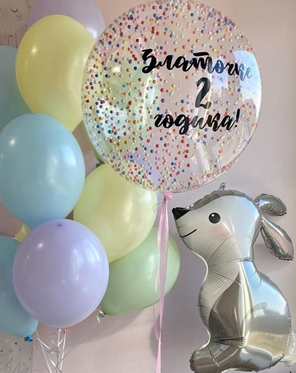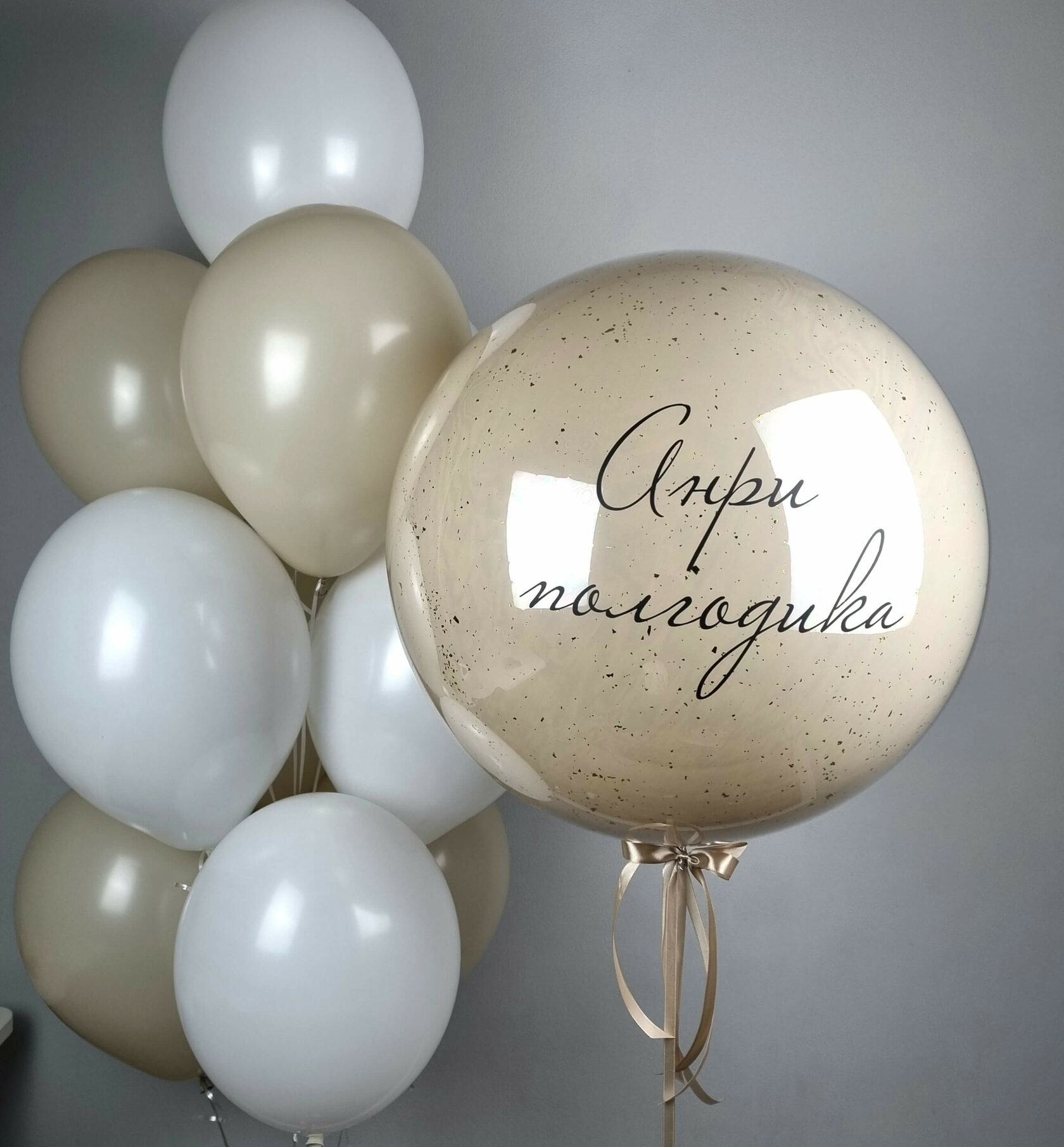 В набор входит: Большой стеклянный шар с конфетти 55 см с индивидуальной надписью; Фонтан из 10 шаров (2 хром, 1 с конфетти, 7 латекс).