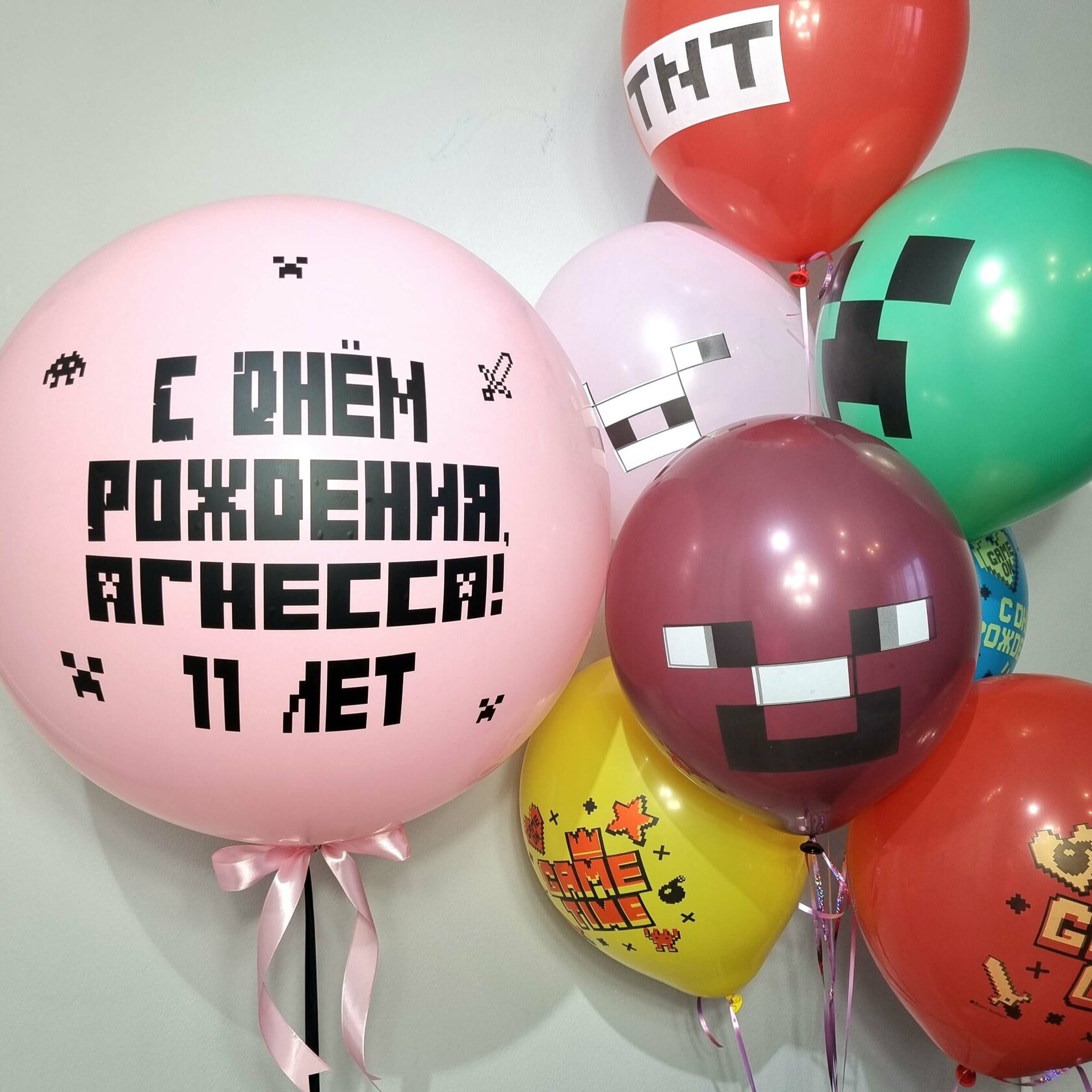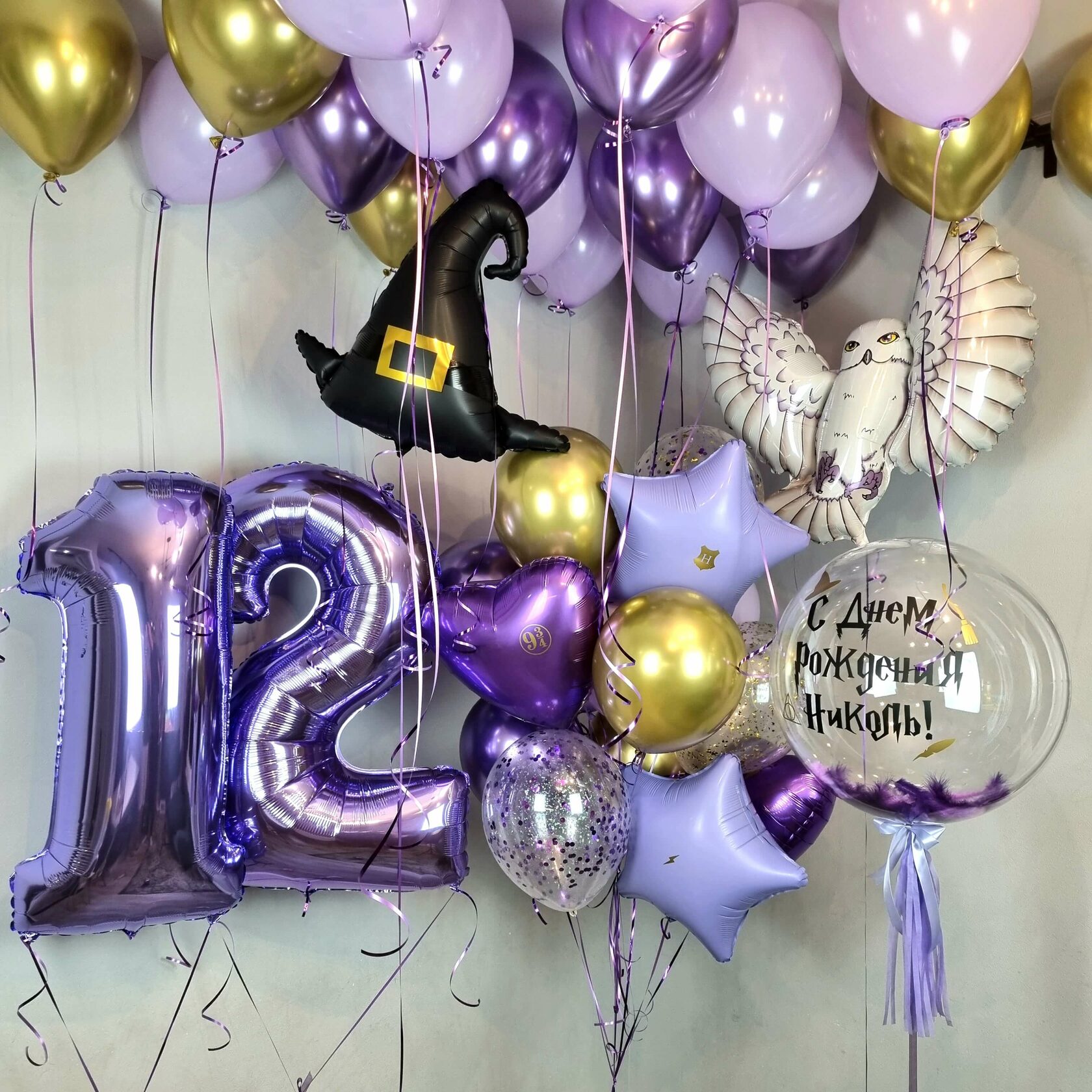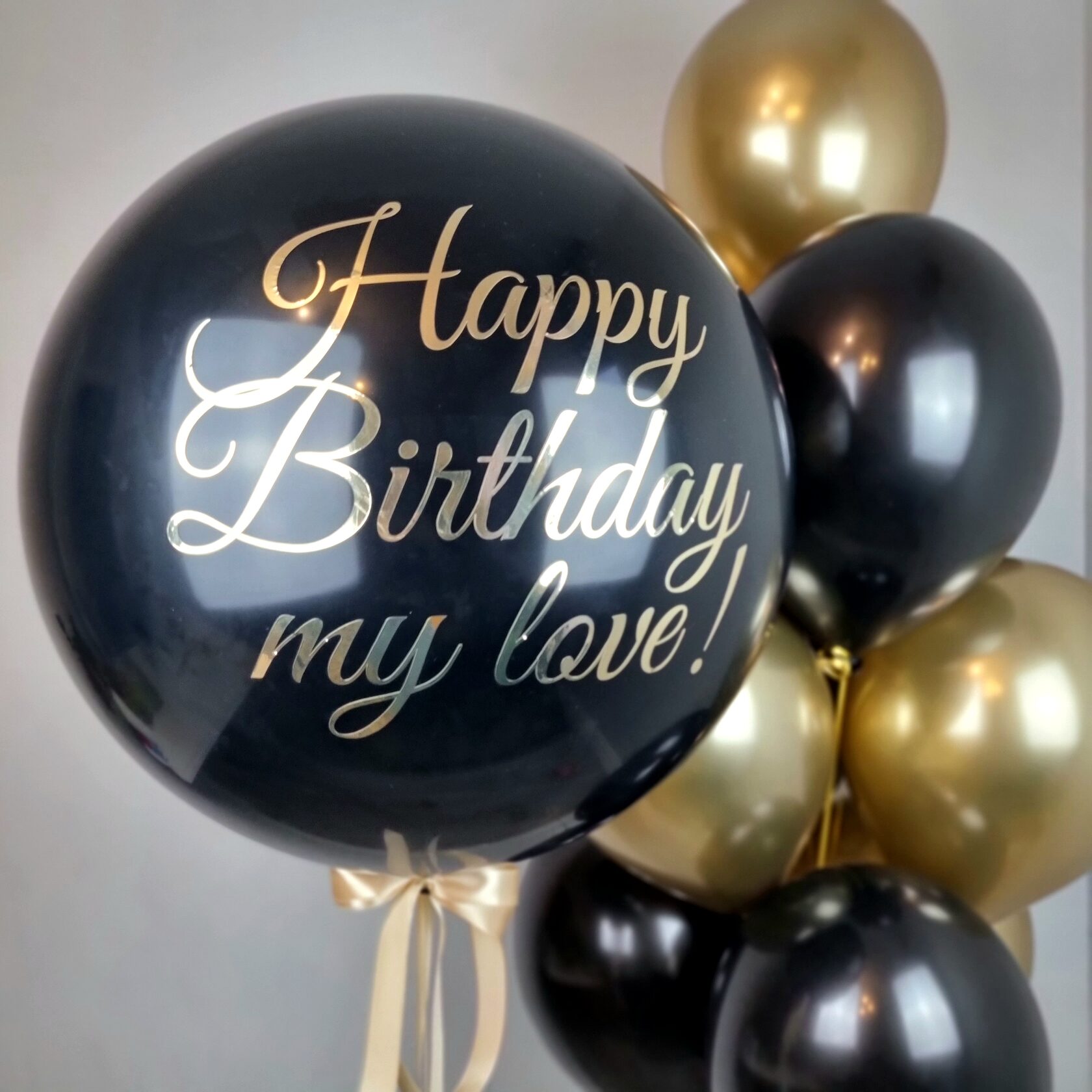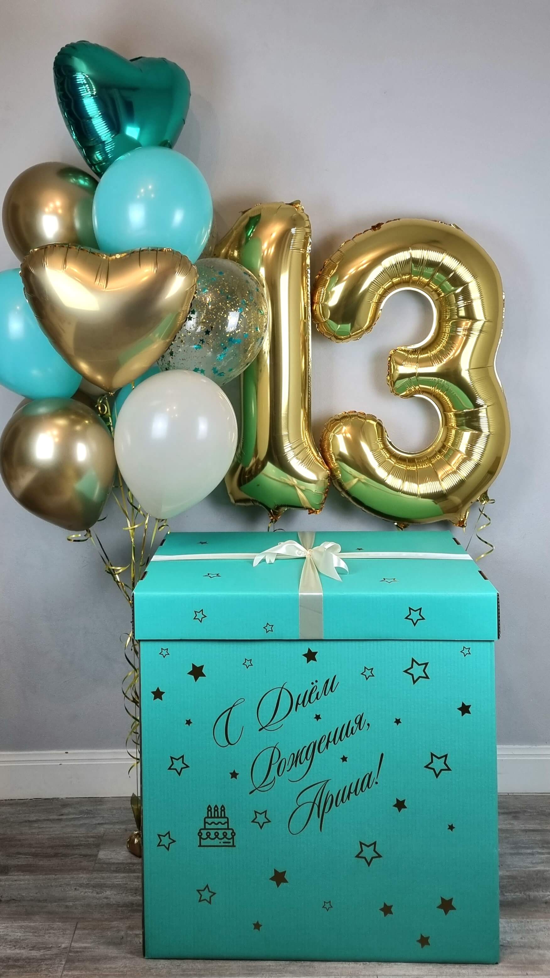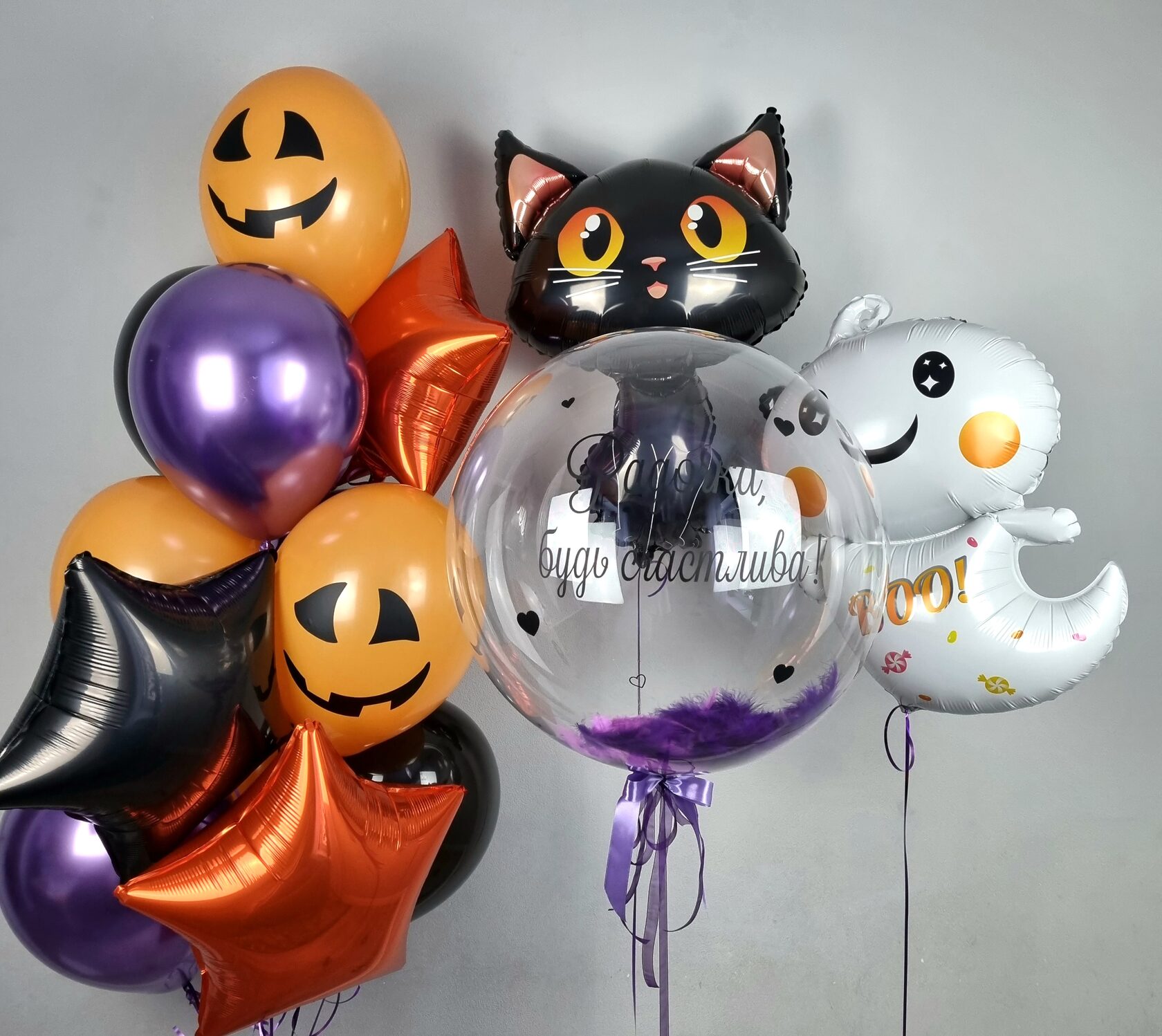 В набор входит: Большой стеклянный шар с конфетти 55 см с индивидуальной надписью; Фонтан из 10 шаров (2 хром, 1 с конфетти, 7 латекс).