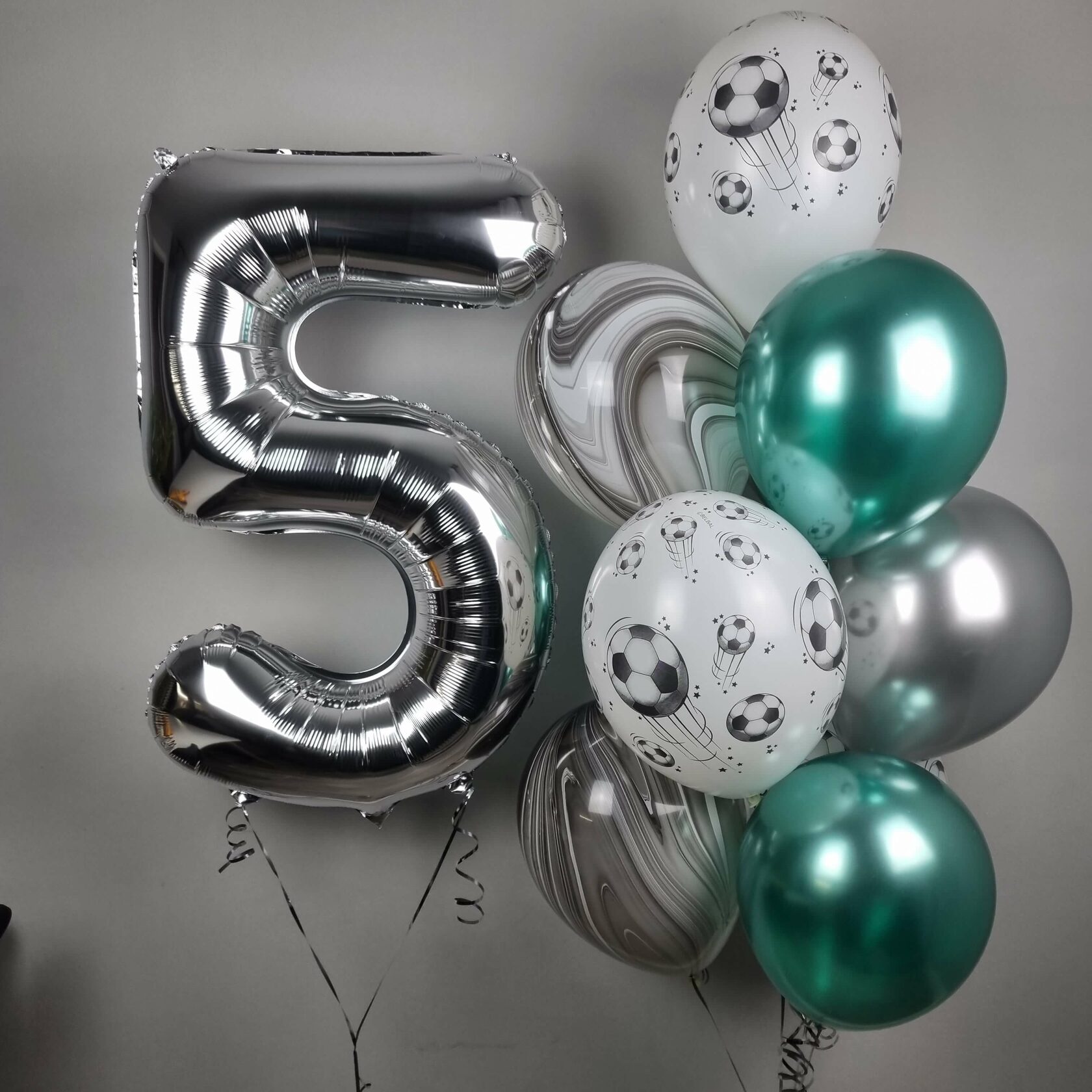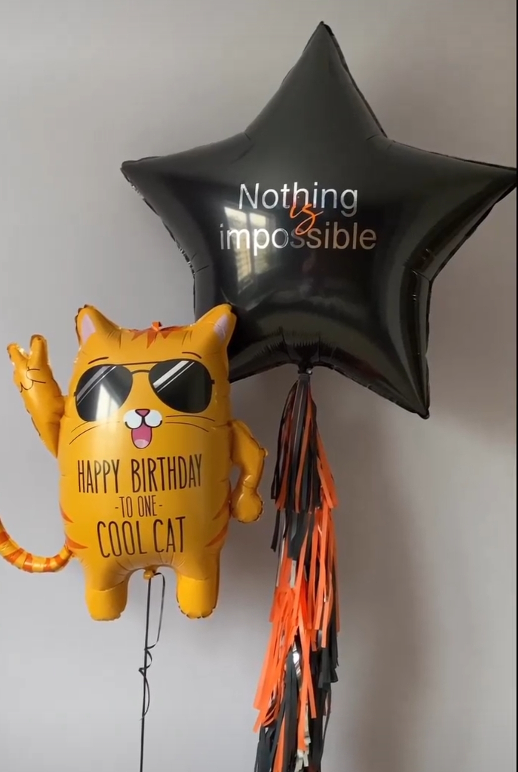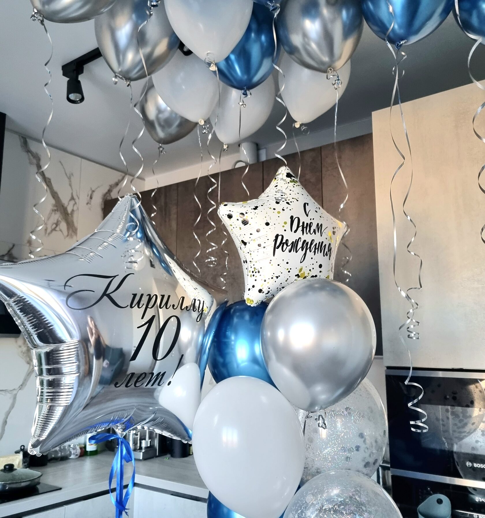 В набор входит: Большая фольгированная звезда с индивидуальной надписью; Фонтан из 7 шаров (1 фольгированные фигуры с надписью" ,3 хром,1 с конфетти, 2 латекс).